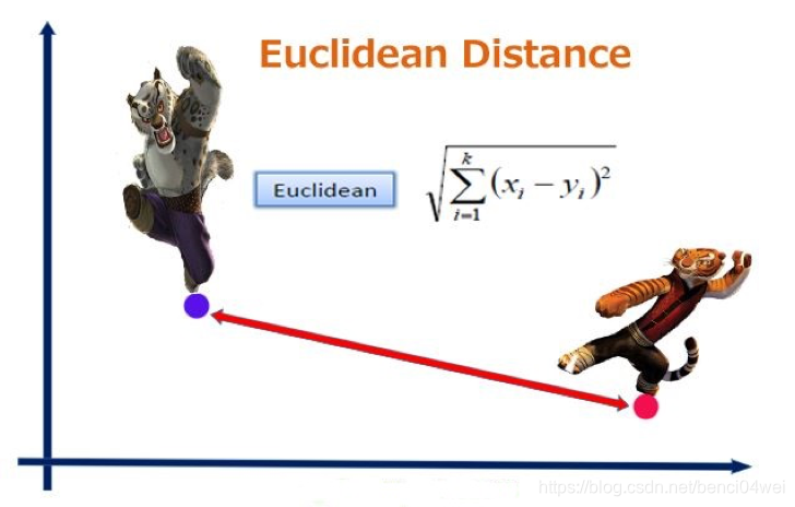 由公式可以看出,欧式距离就是计算这两个向量的差的模长。例如在下图所示平面直角坐标中,欧式距离就是两个向量表示的两点间的实际距离,这很符合我们的常规思维,即向量表示的两点间的距离越近,那么这两个向量之间就越相似。