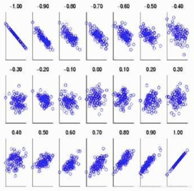 由公式可知,Pearson 相关系数就是协方差和标准差的商。当相关系数为正值时,变量呈正相关;系数为负值时呈负相关,相关系数的绝对值越大,线性相关性越强。