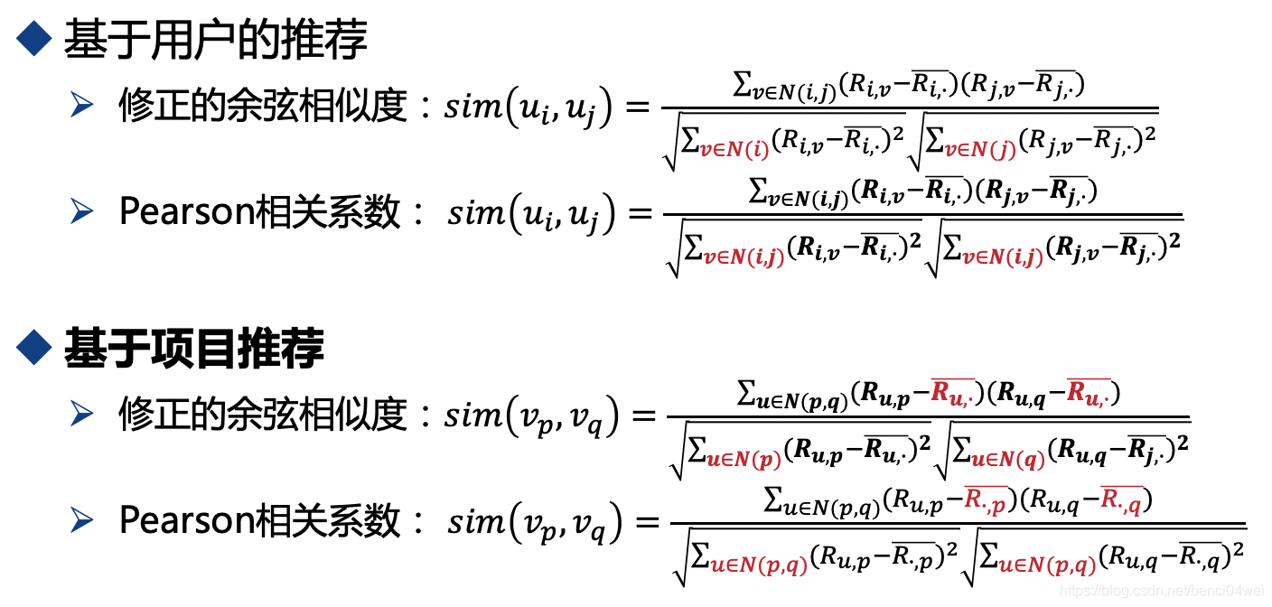 Perason相关系数的公式与修正的余弦相似度很相似,很容易混淆。那么他们有哪些区别呢?由定义可知,修正的余弦相似度是为了修正不同用户的评分数值标准的差异性的影响,所以不论是计算用户间的相似度,还是计算项目间的相似度,中心化时所减去的均值总是该评分所对应的用户的评分均值;而Pearson定义为协方差和标准差的商,所以自然地进行了中心化处理,减去的均值可能是用户均值,也可能是项目均值。