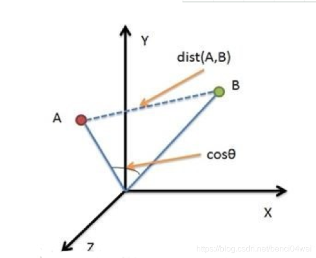 欧氏距离是最常见的距离度量,而余弦相似度则是最常见的相似度度量,很多的距离度量和相似度度量方法都是基于这两者的变形和衍生,所以下面重点比较下两者在衡量个体差异时的实现方式和应用环境上的区别。我们借助三维坐标系来看下这两者的区别: