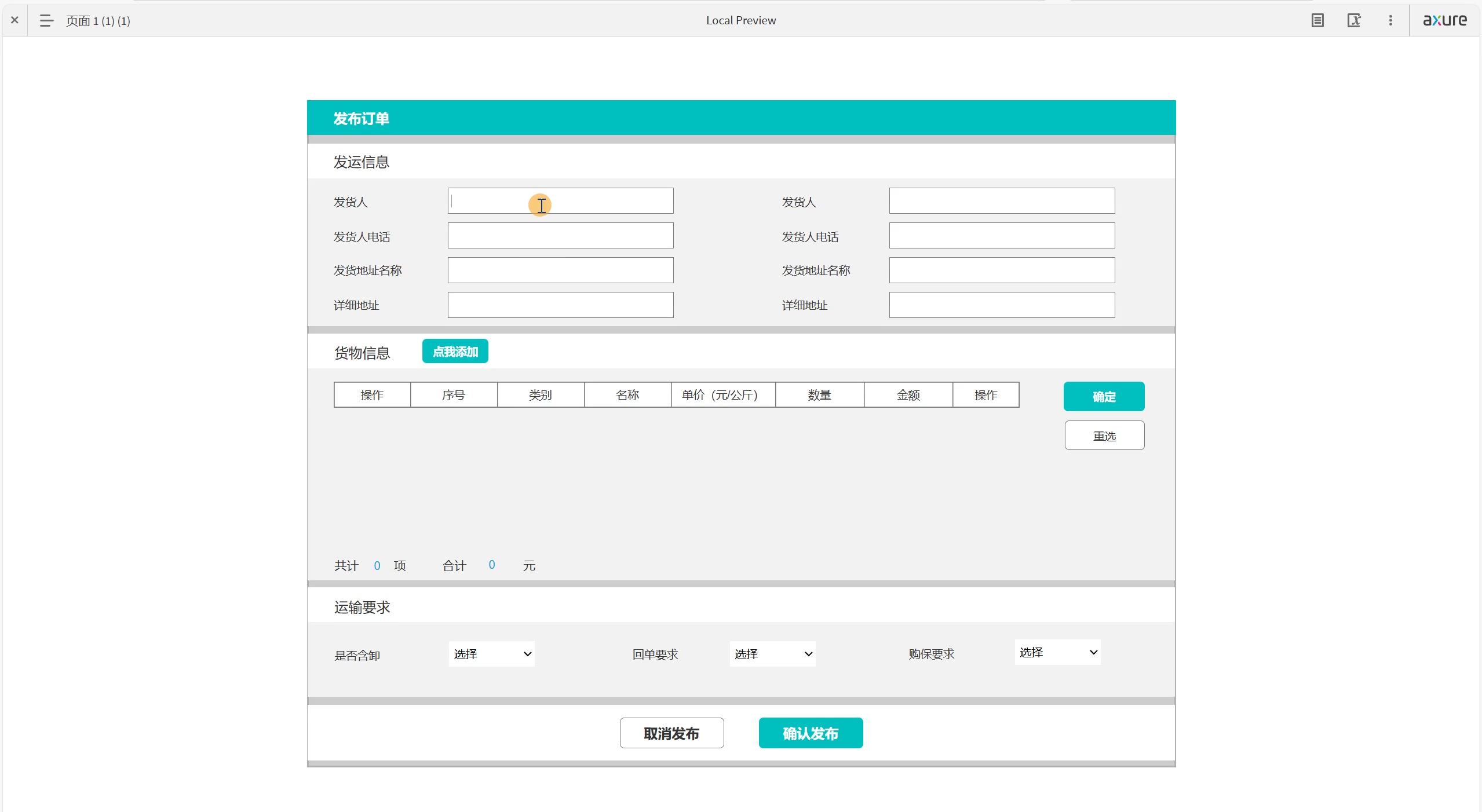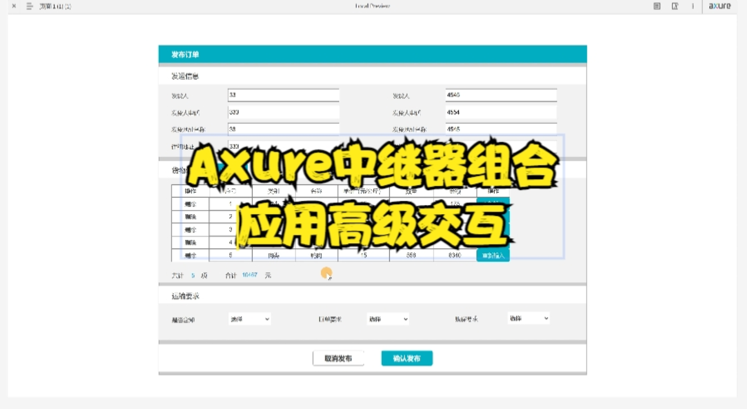 案例分析:发布订单时需要添加货物信息,货物信息由基础标准表单组成,从基础标准表单中取出要发运的货物,在订单页进行货物数量的手动配置,自动计算金额及总数量;步骤一:先制作基础标准表单,拖入中继器按下图内容进行基础内容的录入,在录入完所有数据后,添加按钮,组合转成动态面板;步骤二:制作订单中继器,先不要加交互,等两个中继器基本素材准备好,在制作;步骤四:配置第二个中继器。