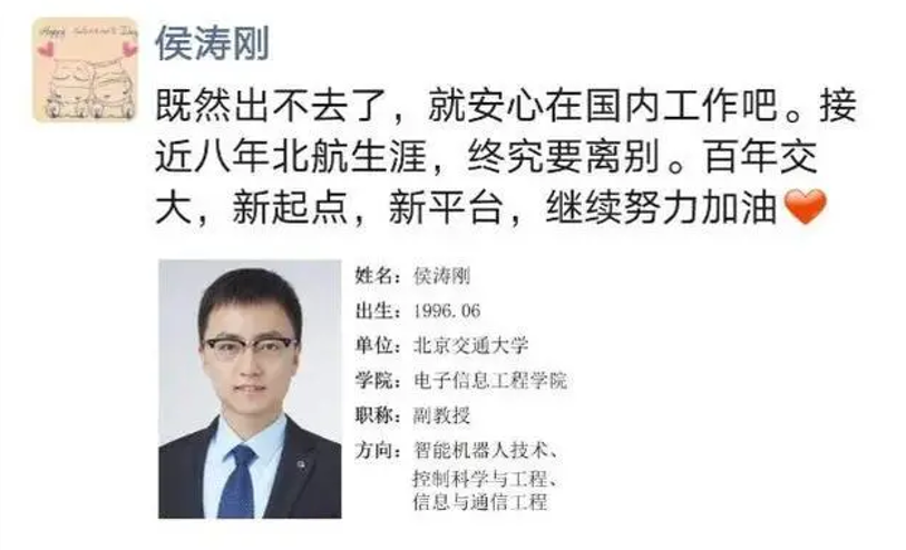 主人公是北京航空航天大学2020届博士毕业生侯涛刚,别人还在研究生头秃的年纪,1996年出生的他不仅拿下博士毕业证,还受聘211高校北京交通大学,成为电子信息工程学院副教授。
