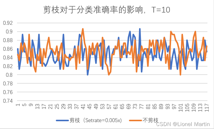 分析可知,平均来说,剪枝准确率甚至比不剪枝的平均准确率还少了约1%,但结合图像变化,可以认为,剪枝操作对准确率的提升不大。