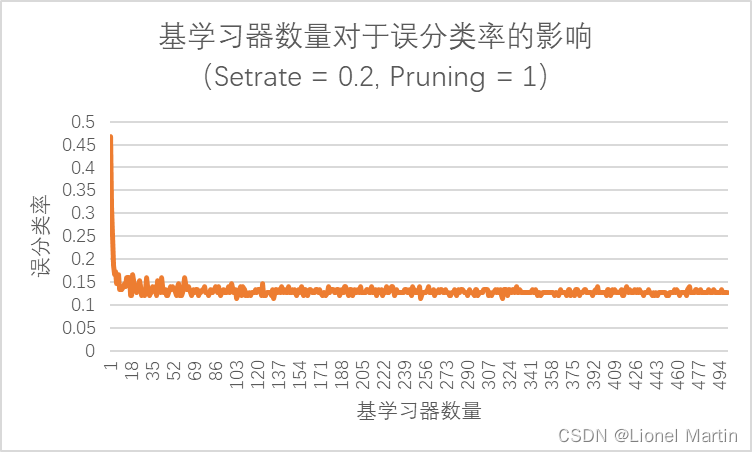 观察图片可知bagging集成技术对于误分类率的优化是现象级的,当T=1时,ER (ErrorRate) = 46.67%. 但是当T=20时,ER = 14%. 但是当基学习器大幅度增加时,误分类率未见明显增长基本稳定在13%左右,即