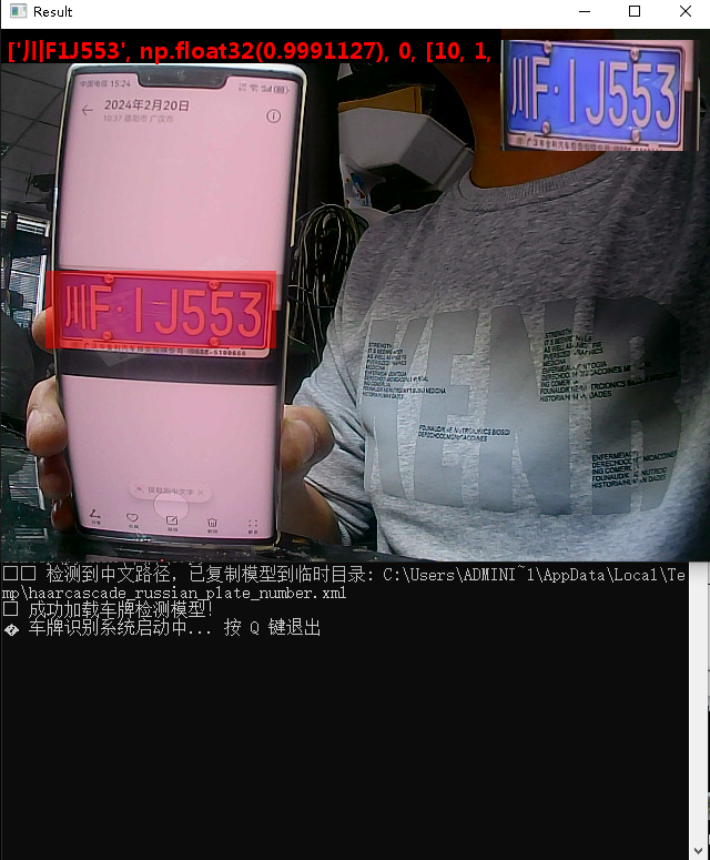 自动路径修复 能自动识别中文目录并将模型复制到英文临时目录,彻底解决加载失败问题。 实时识别 使用 OpenCV 实时检测车牌,HyperLPR3 进行车牌识别。 中文输出 支持中文车牌号显示,不乱码。 稳定可靠 各关键点都有错误检测与提示,防止程序崩溃。 视觉友好 半透明矩形与小预览窗口让识别结果一目了然。