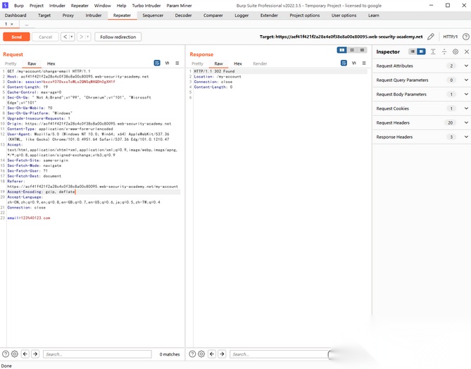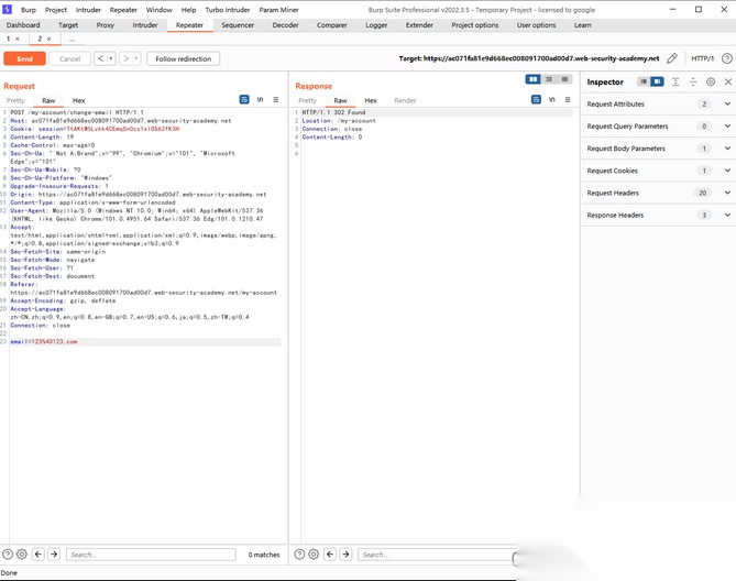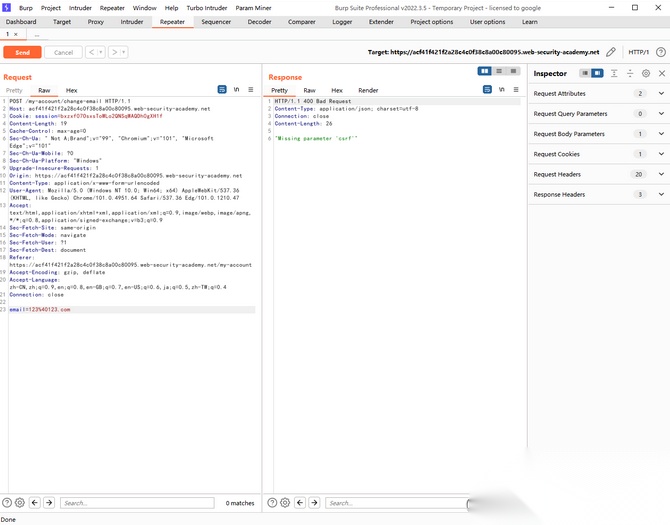 我们先登录进靶场当中,发现有一功能点 ———— Update email