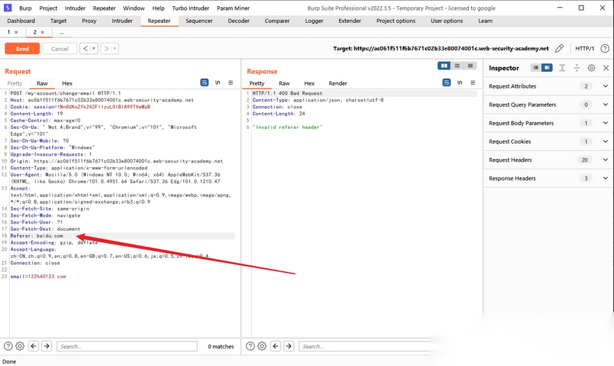 我们先修改 Referer 为 baidu.com 查看回显,成功发包。