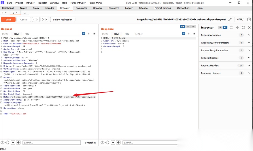 修改 Referer 为baidu.com+?laburl,回显为 302 成功。