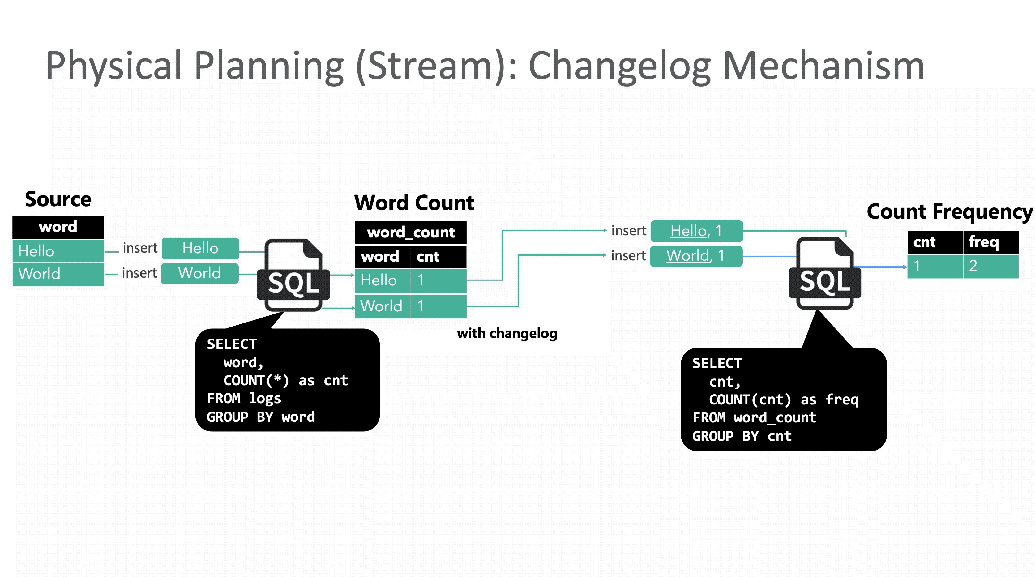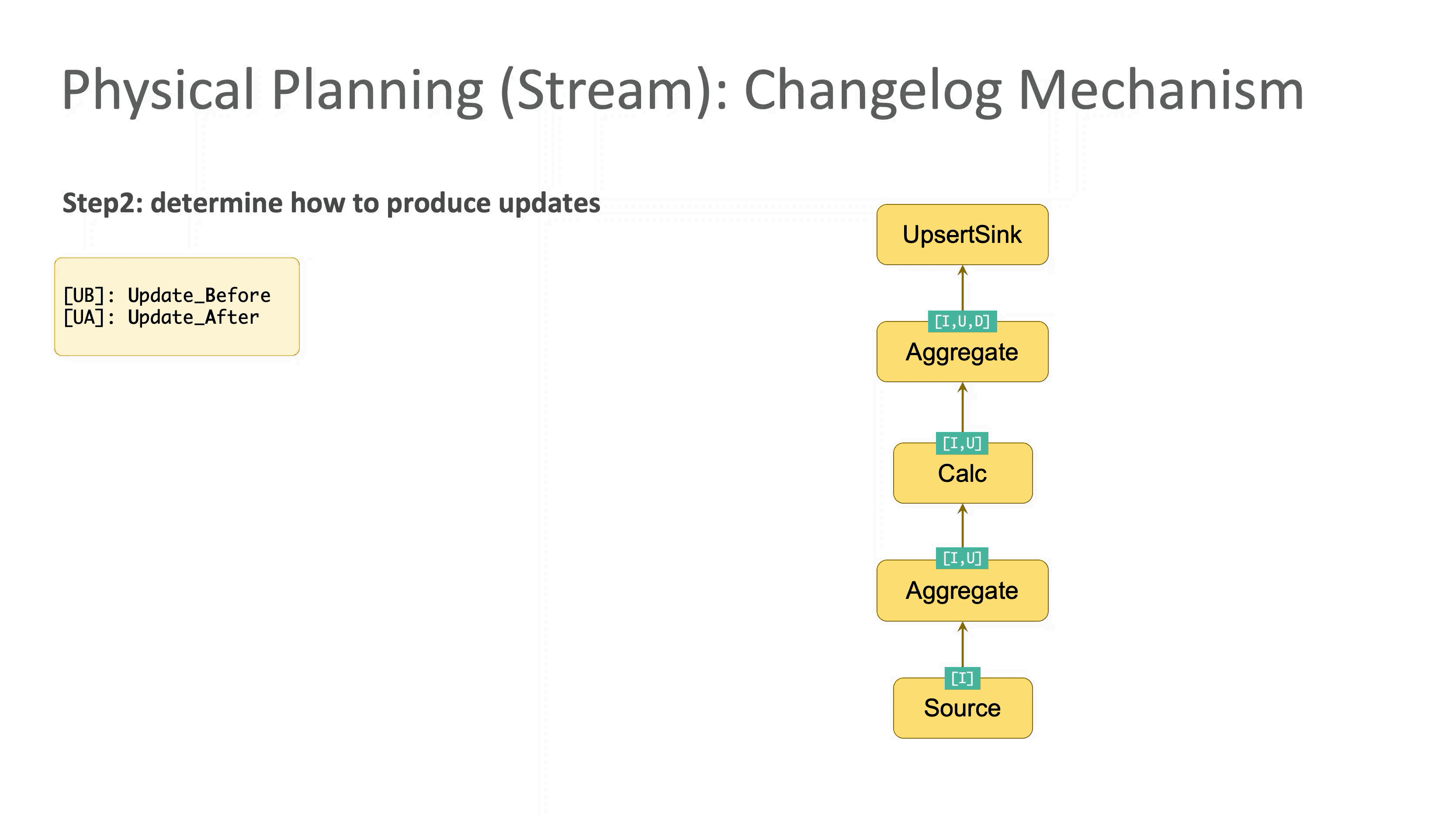 这些标签最终会影响算子的物理实现,比如外层的 Aggregate 节点,由于它会接收到来自上游的 [UB],所以物理实现会使用带 Retract 的 Count,同时它只会向 Sink 发送 update_after。而内层的 Aggregate 节点,由于上游发送过来的数据没有 [UB],所以可以采用不带 Retract 的 Count 实现,同时由于带有 [UB] 标签,所以需要往下游发送 update_before。