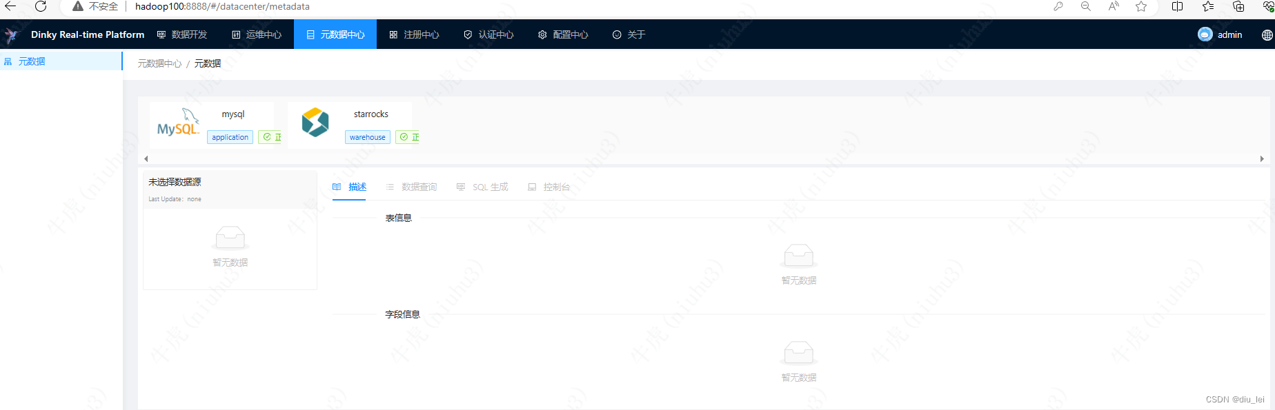 Dinky-元数据中心源码详解 我们先看看元数据中心有哪些功能,举个例子,我们先点击mysql数据源可以清楚的看到mysql数据库中有哪些库点开dinky数据库的dlink_alert_group,可以看到这个表的所有元数据信息,内容非常的全面然后点击数据查询页面可以看到这个表中的数据,也可以根据筛选条件和排序字段进行自定义查询点击SQL生成可以生成相关的DDL sql在控制台就可以自己写各种sql操作我们的数据库和表。