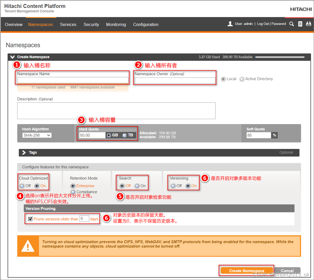 注:如果对象存储管理员不希望用户创建桶,可以在对象存储管理界面关闭桶创建权限。