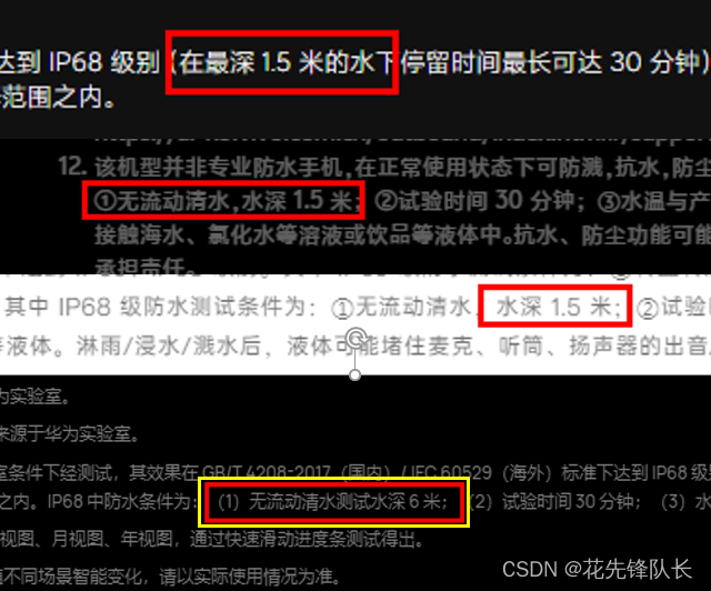 在 Mate 60 Pro 官网上,标注着手机的防水测试标准为 6 米,而同样的其他家手机厂商在2024年最新发布的旗舰手机,测试标准只有 1.5 米,仅仅测试标准一项,就拉开了 4 倍差距。