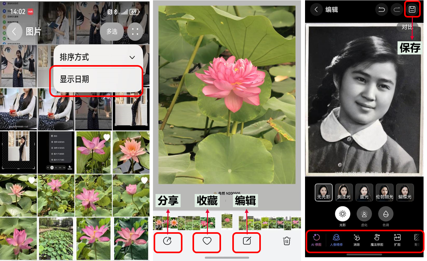 升级鸿蒙5后的图库有了更加丰富的功能。在图片下方有三个重要的按钮,分别是分享、收藏和编辑可以教给他们。【分享】可以把照片一键分享给家人朋友;【收藏】则能把喜欢的照片、重要的照片标记起来,方便下次查找;最重要的是【编辑】按钮里的AI修图,可是谁用谁爱,老照片一键扩图、人像精修,让老爸老妈拍的老照片焕然一新。