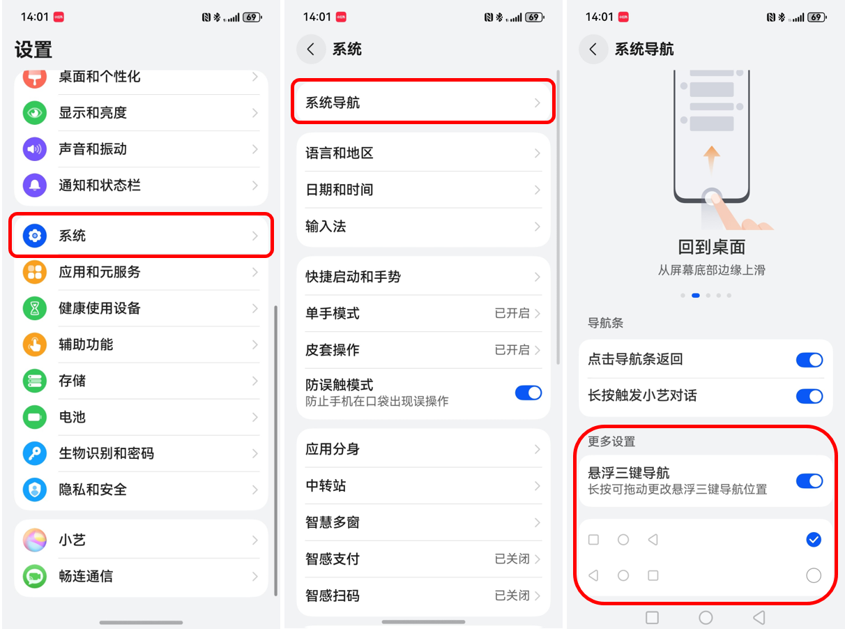 对于习惯了传统导航方式的长辈来说,三键导航用习惯了更加简单直接。其实鸿蒙5系统也适配了三键导航。操作方法很简单,在【设置】—【系统】—【系统导航】—【悬浮三键导航】,选中后那熟悉返回键、主页键和最近任务键回归。熟悉的界面,熟悉的操作感这不就回来了。