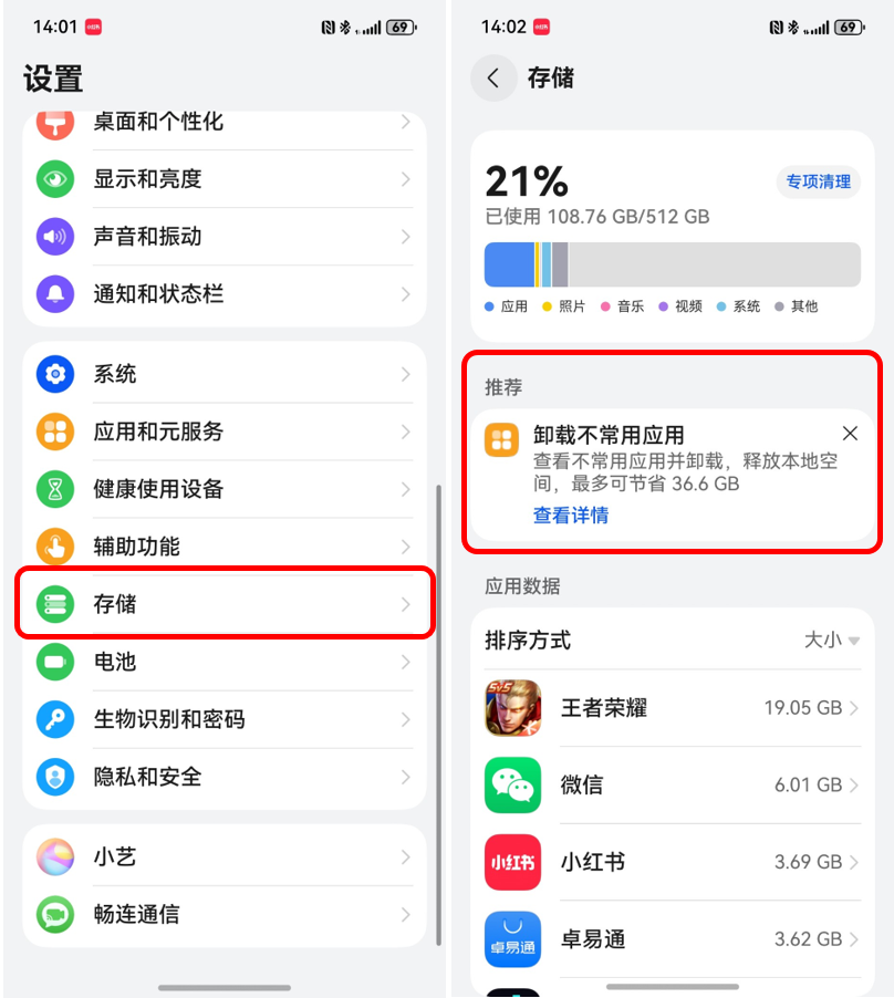 如果有需要清理冗余文件,可在【设置】-【存储】进行应用存储管理,建议对图库空间、大文件、不常用应用等进行专项清理即可。