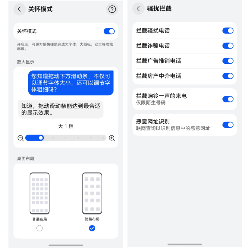 鸿蒙5手机到手,记得帮长辈开启设置中的【关怀模式】,一键调大字体、开启骚扰拦截防护,还能设置简洁大图标的简易布局,谁用谁知道有多香。