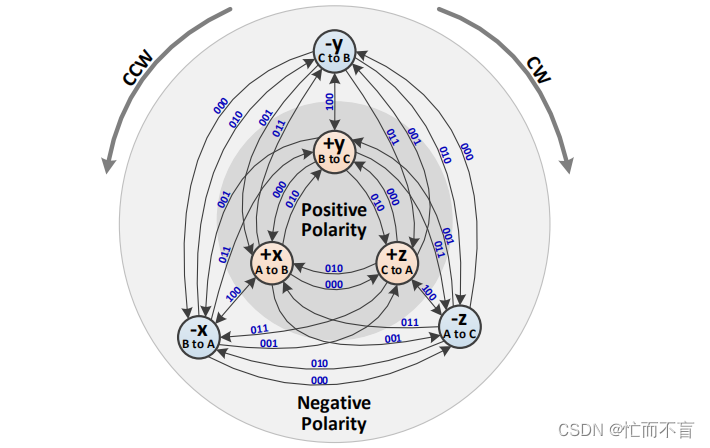 线态(Wire State): 在任一时刻,A, B, C三根线被驱动到三个不同的电压电平(例如,0mV, 100mV, 200mV)。由于三者各不相同,共有6种可能的排列组合,即6种线态。
