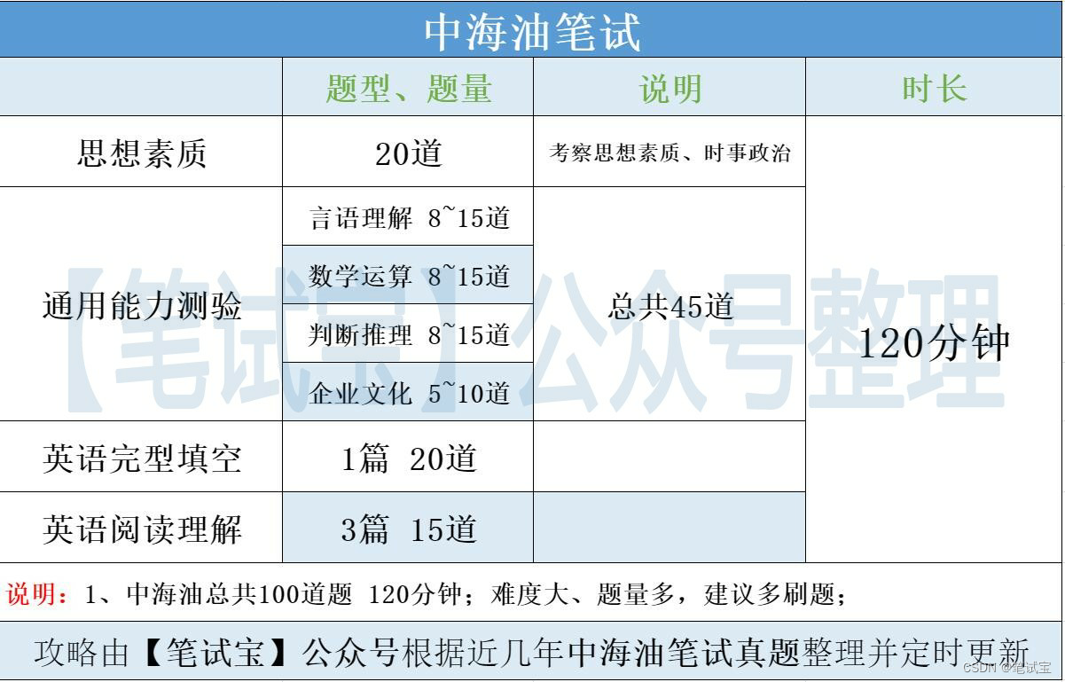 每道题给出一道算术式子,或者表达数量关系的一段文字,要求考生熟练运用加、减、乘、除等基本运算法则,利用基本的数学知识,准确、迅速地计算出结果,从四个备选项中选出正确的一项。A:中海油笔试在三桶油笔试中,难度相对是小一点的,但是相对普通企业测评笔试来说,难度不算小,尤其是通用能力测验部分;通用能力测验(言语理解 8~15道,数学运算 8~15道,判断推理 8~15道,企业文化 5~10道),中海油在线考试难度还是挺大的,通过率很低,建议多刷真题,提高通过率;Q:中海油校招考试形式?Q:中海油校招考试难不难?
