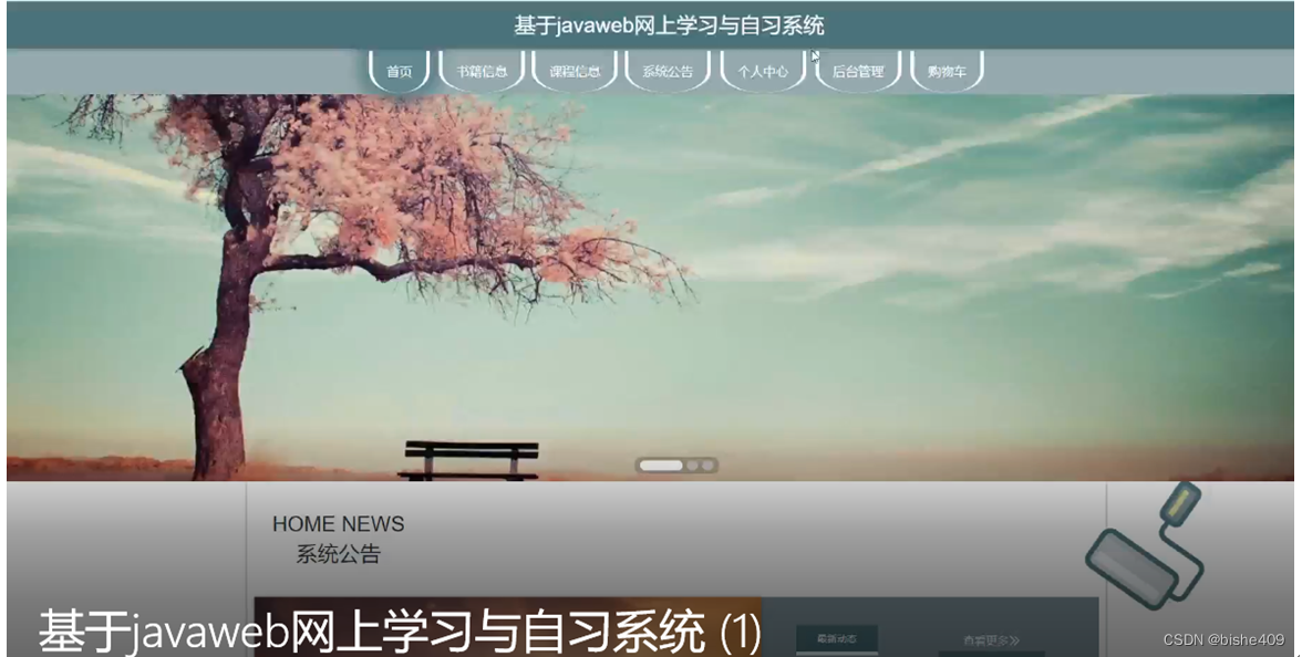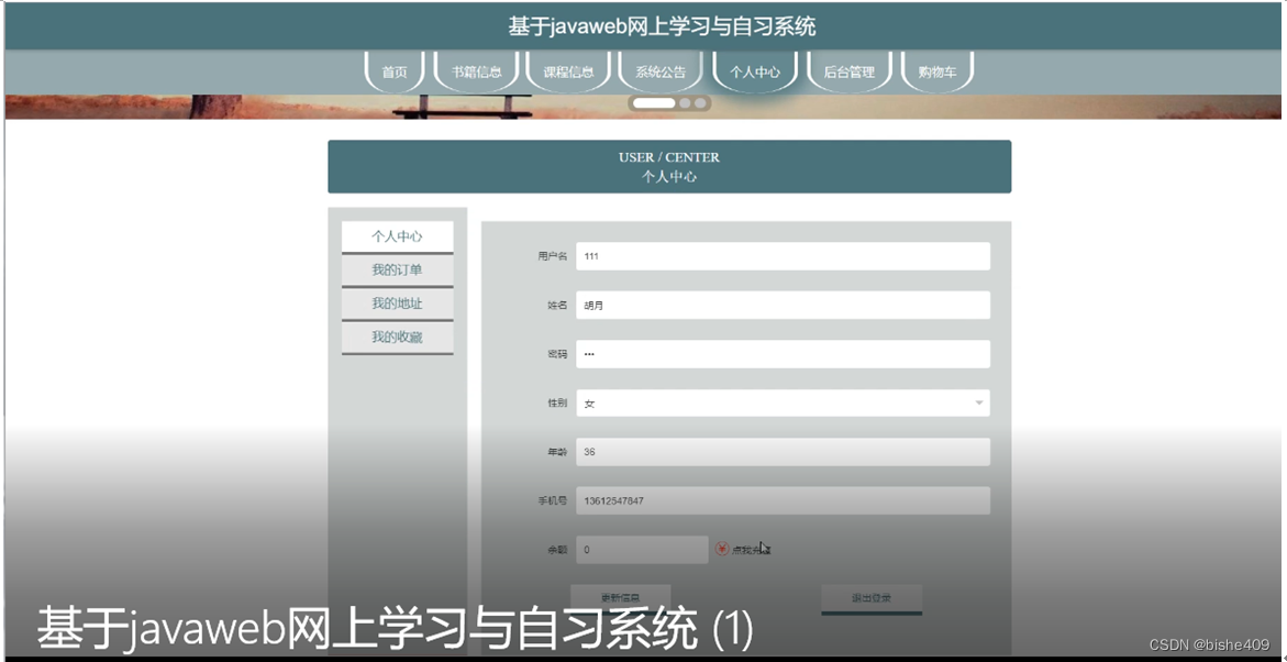 网站学习与自习系统,在系统首页可以查看首页,书籍信息,课程信息,系统公告,个人中心,后台管理,购物车等内容,并进行详细操作;如图5-1所示。