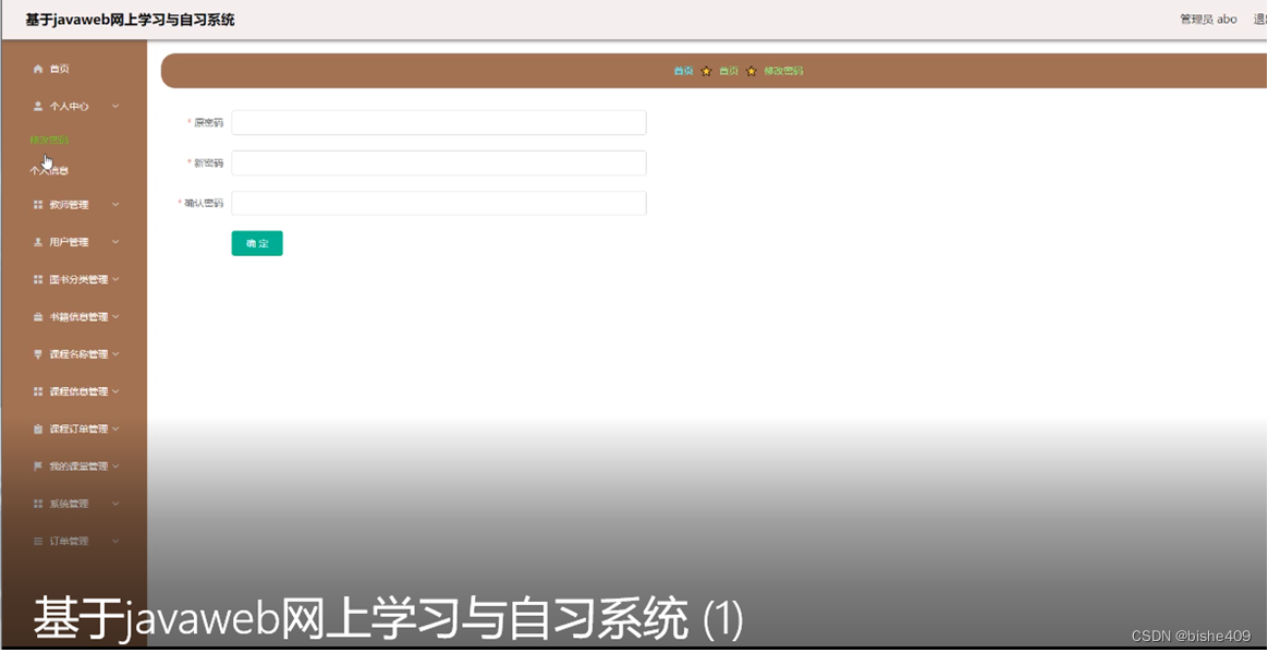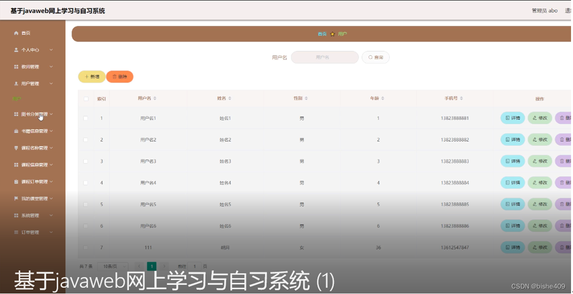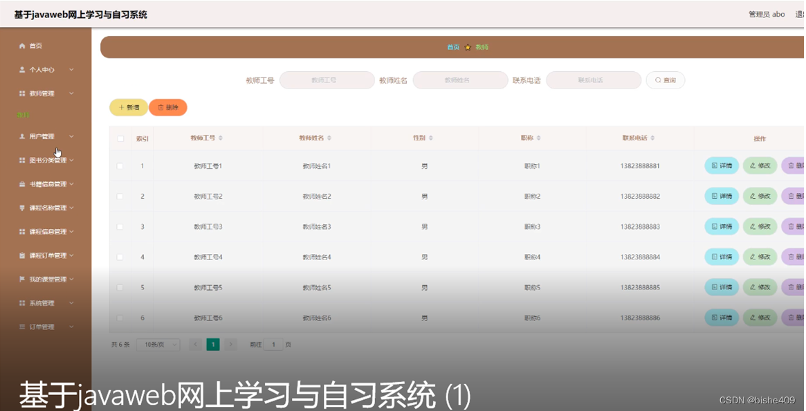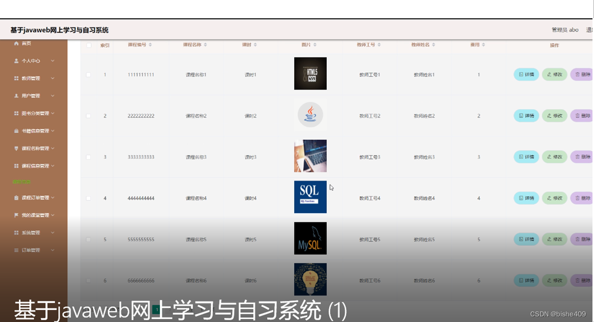 模块包括首页,个人中心,教师管理,用户管理,图书分类管理,书籍信息管理,课程名称管理,课程信息管理,课程订单管理,我课堂管理,系统管理,订单管理等进行相应的操作。
