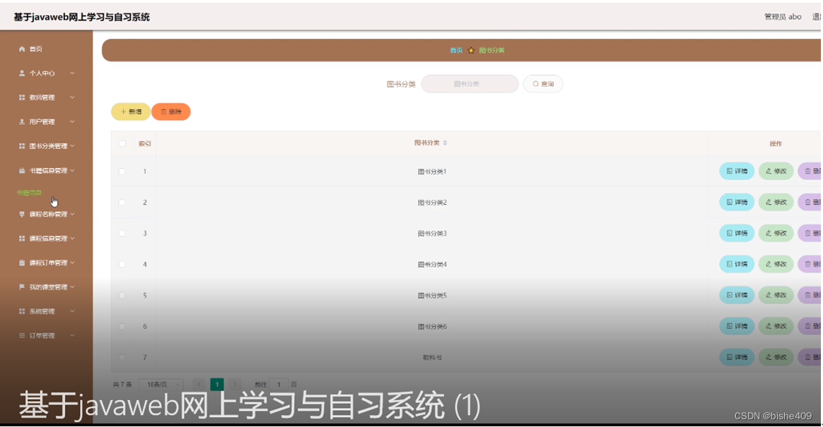 图书分类管理,在图书分类管理页面可以对索引,图书分类等内容进行详情,修改和删除等操作,如图5-9所示。
