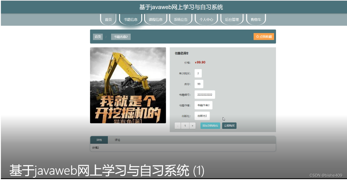 本系统采用SSM+mybatis+Maven+Vue等技术构建,支持书籍信息、课程管理等功能。用户可在系统中完成注册、购买书籍等操作,管理员则能进行全方位的内容管理。