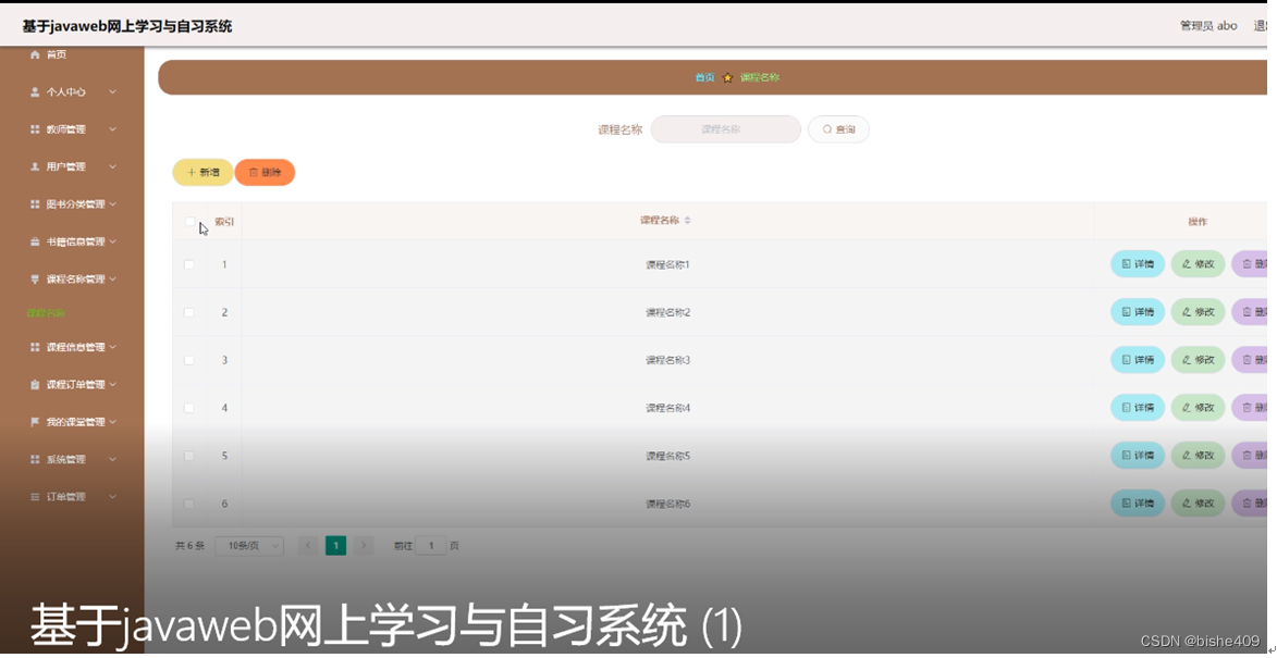 课程名称管理,在课程名称页面可以对索引,课程名称等内容进行详情,修改和删除等操作,如图5-11所示。