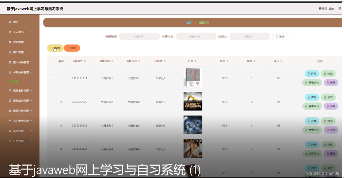 书籍信息管理,在书籍信息管理页面可以对索引,书籍编号,书籍名称,书籍作者,出版社,封面,价格,单限,库存等内容进行详情,,修改,查看评论和删除等操作,如图5-10所示。