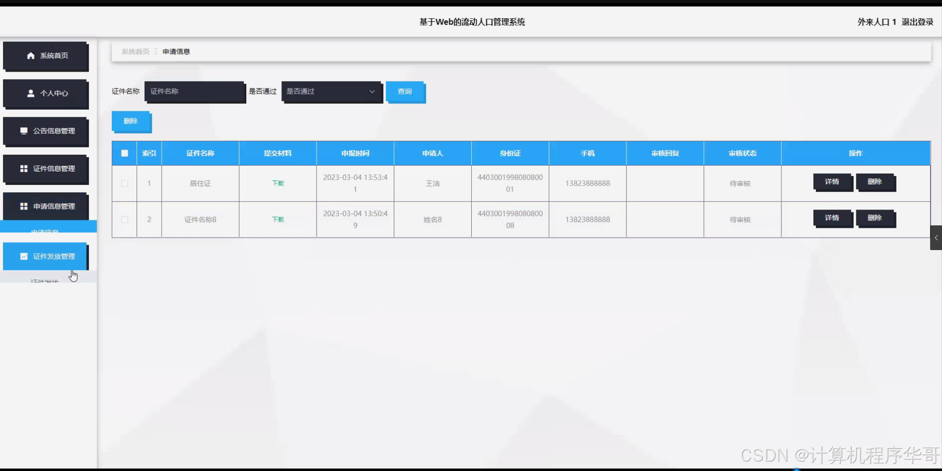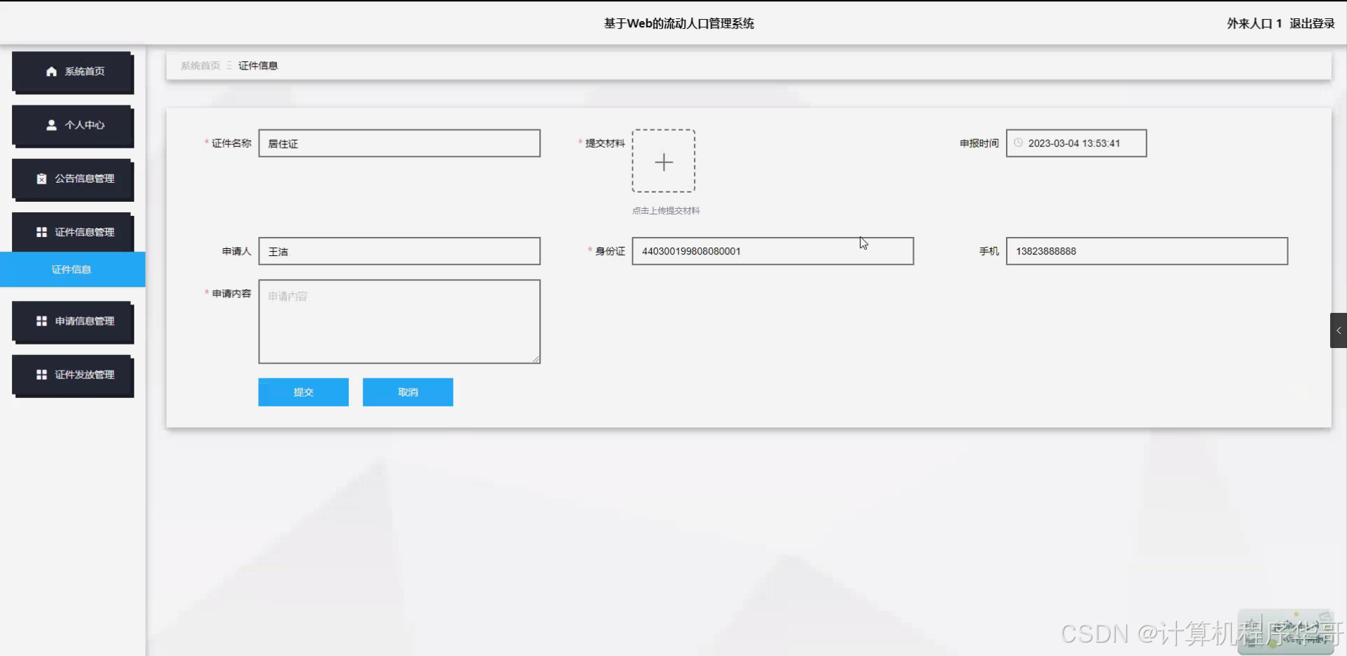 本研究旨在设计并实现一个功能完善的流动人口管理系统,以满足当前社会对流动人口管理的迫切需求。该系统将涵盖外来人口和本地人口的登记管理、申请信息的处理、证件信息的录入与查询、证件的发放与更新以及公告信息的发布等功能。通过该系统的实施,旨在实现流动人口信息的快速录入、高效查询和动态管理,提高城市管理的智能化和精细化水平,为城市的可持续发展提供有力保障。