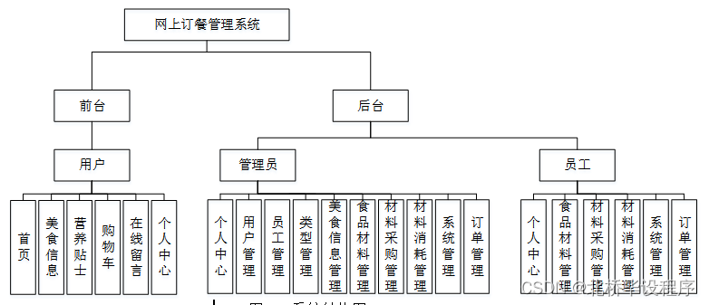 网上订餐管理系统分为三个部分,即管理员管理、员工管理和系统用户管理。该系统是根据用户的实际需求开发的,贴近生活。从管理员处获得的指定账号和密码可用于进入系统和使用相关的系统应用程序。管理员拥有最大的权限,其次是员工。管理员一般负责整个系统的运行维护和总体协调。