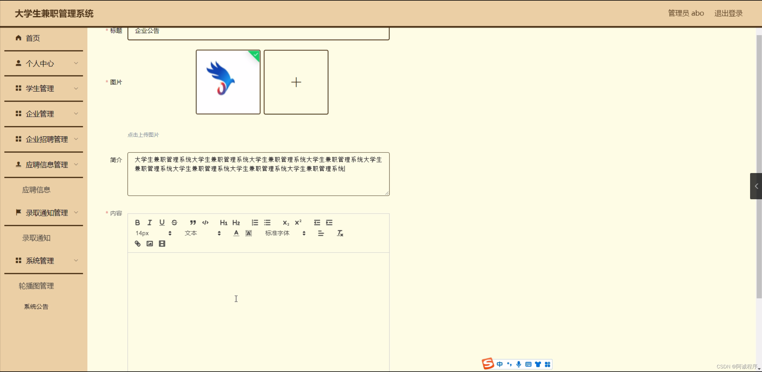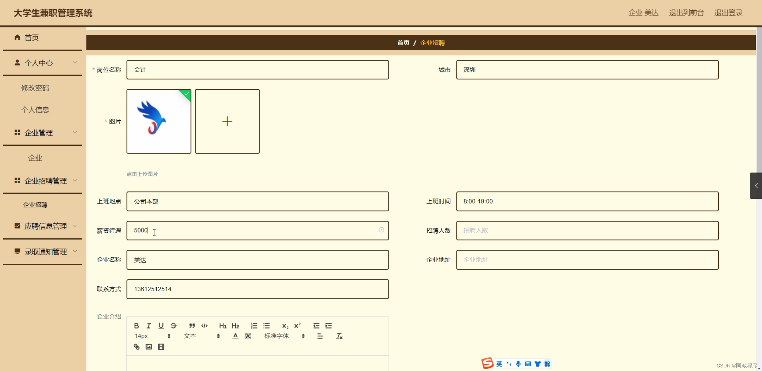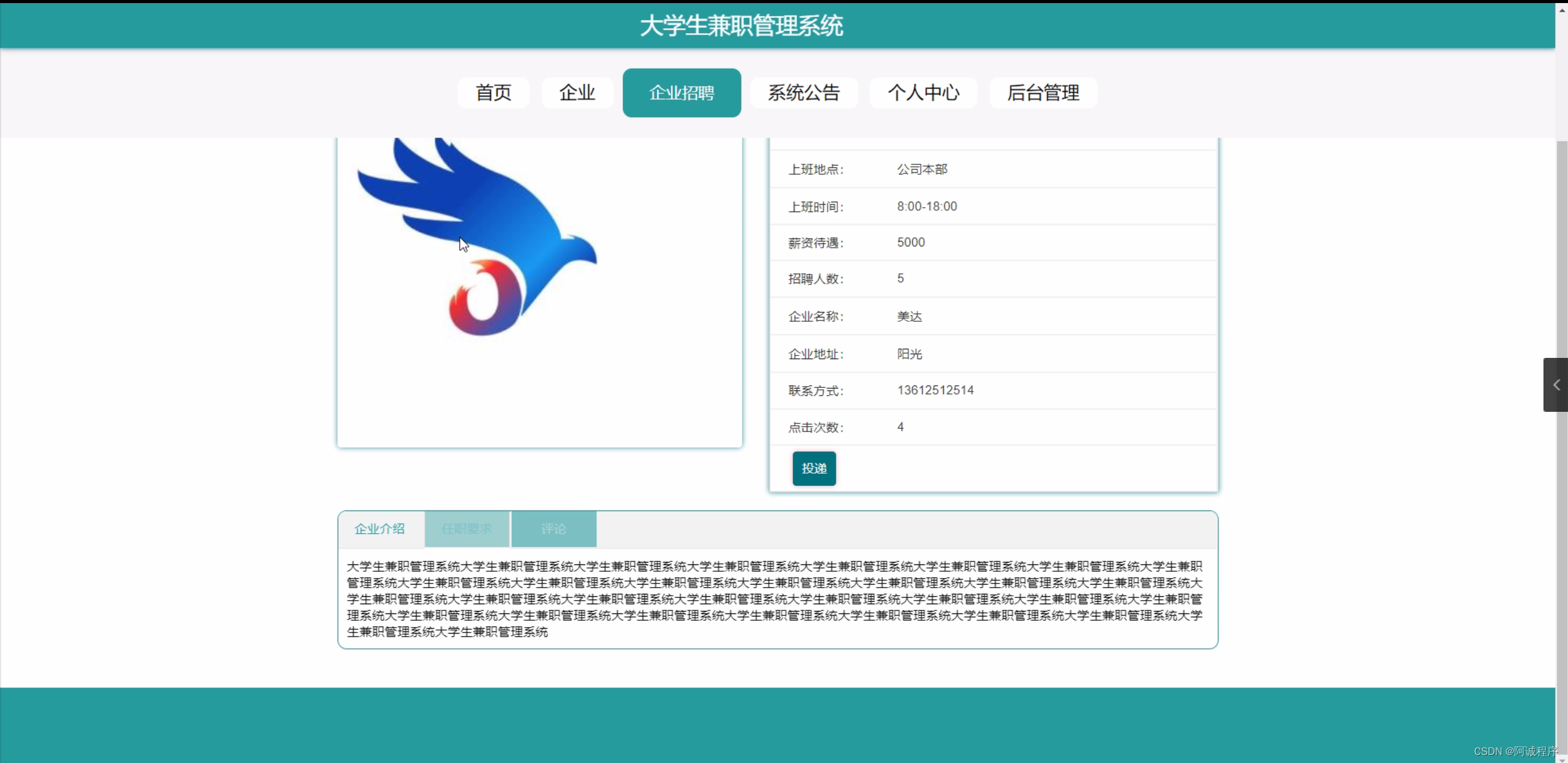 选题背景: 随着高等教育的普及,大学生数量逐年增加,他们在校期间面临着学业压力和生活费用的双重挑战。为了缓解经济压力,提升实践能力,越来越多的大学生选择利用课余时间进行兼职工作。然而,由于缺乏有效的管理和指导,大学生在寻找兼职工作时常常遇到信息不对称、权益保护不足等问题。此外,学校和用人单位之间也缺乏一个有效的沟通平台,导致兼职机会与学生需求不能有效匹配。因此,构建一个专门针对大学生兼职管理的系统显得尤为必要,以期为大学生提供安全、高效、便捷的兼职信息服务,同时也为学校和用人单位提供一个可靠的合作平台。