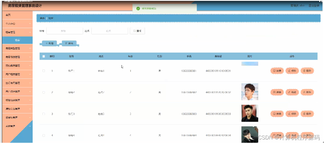 租客管理,在租客管理页面可以对索引,账号,姓名,年龄,性别,手机,身份证,照片等内容进行详情,修改和删除等操作,如图5-7所示。