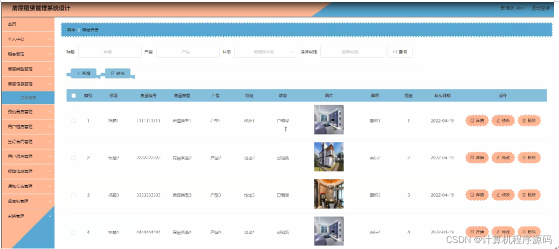 房屋信息管理,在房屋信息管理页面可以对索引,标题,房屋编号,房屋类型,户型,地址,状态,图片,面积,租金,发布日期等内容进行详情,修改和删除等操作,如图5-8所示。