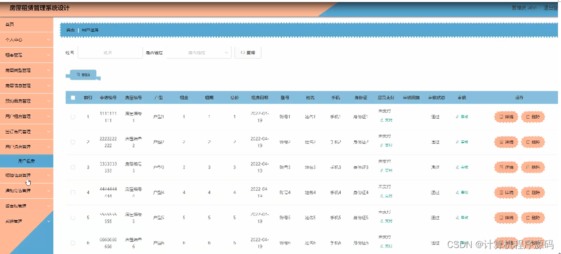 用户退房管理,在用户退房管理页面可以对索引,申请编号,房屋编号,户型,租金,租期,总价,租房日期,账号,姓名,手机,身份证,是否支付,审核回复,审核状态,审核等内容进行详情,删除操作;如图5-12所示。