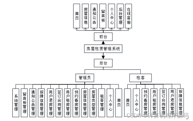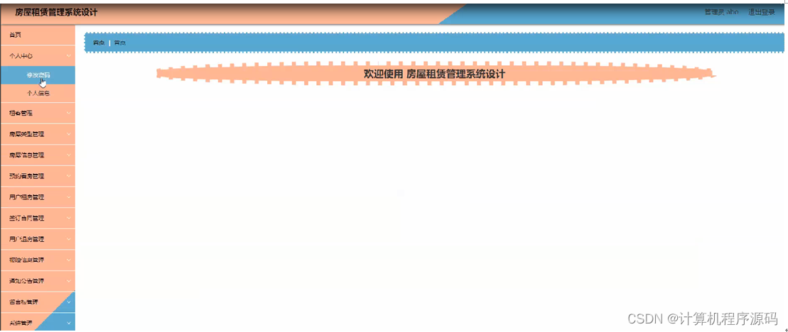 管理员登录系统后,可以对首页,个人中心,租客管理,房屋类型管理,房屋信息管理,预约看房管理,用户租房管理,签订合同管理,用户退房管理,报障信息管理,通知公告管理,留言板管理,系统管理等功能进行相应的操作,如图5-6所示。
