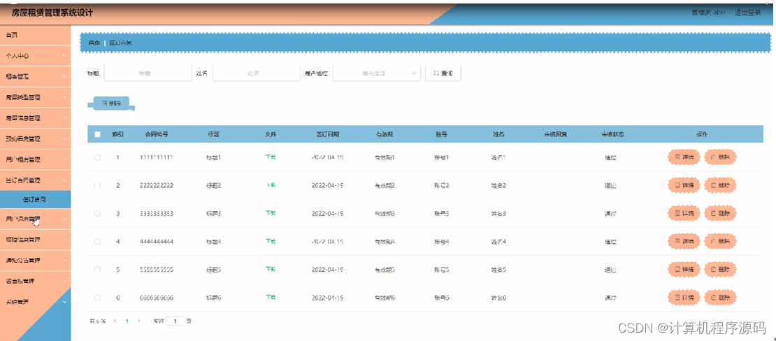 签订合同管理,在签订合同管理页面可以对索引,合同编号,标题,文件,签订日期,有效期,账号,姓名,审核回复,审核状态等内容进行详情,删除操作,如图5-11所示。
