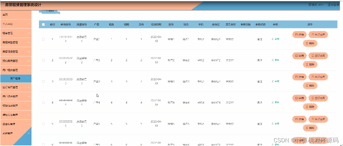 用户租房管理,在用户租房管理页面可以对索引,申请编号,房屋编号,户型,租金,租期,总价,租房日期,账号,姓名,手机,身份证,是否支付,审核回复,审核状态,审核等内容进行详情,签订合同,删除等操作,如图5-10所示。