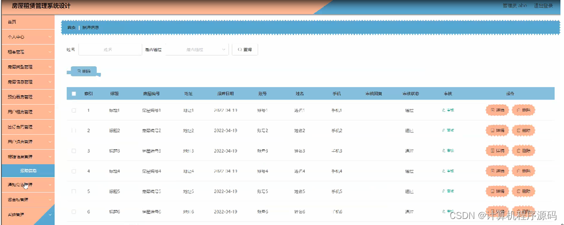 报障信息管理,在报障信息管理页面可以对索引,标题,房屋编号,地址,报障日期,账号,姓名,手机,审核回复,审核状态,审核等内容进行详情,删除操作,如图5-13所示。
