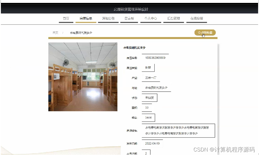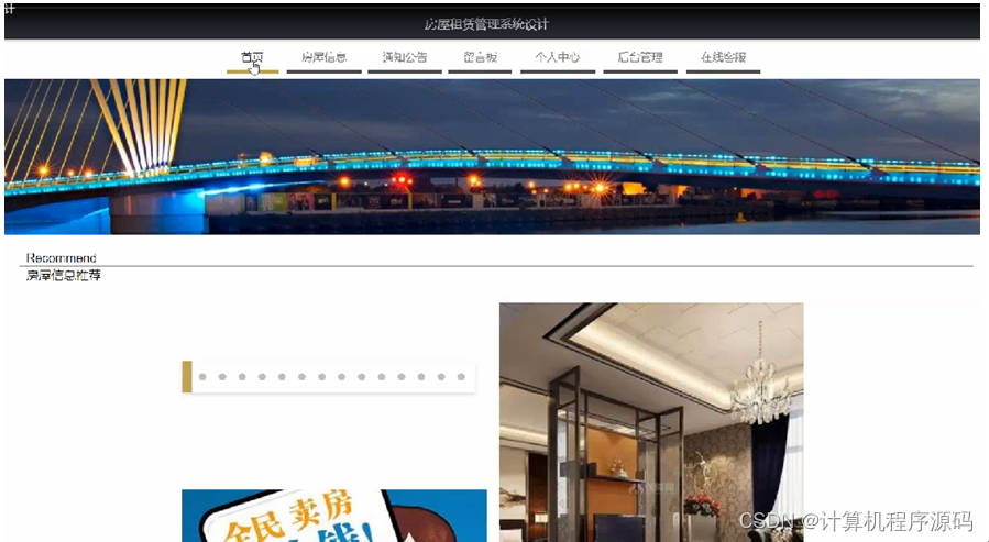 房屋租赁管理系统,在系统首页可以查看首页,房屋信息,通知公告,留言板,个人中心,后台管理,在线客服等内容,并进行详细操作;如图5-1所示。
