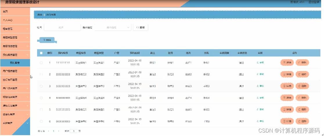 预约看房管理,在预约看房管理页面可以对索引,预约编号,房屋编号,房屋类型,户型,预约时间,备注,账号,姓名,手机,审核回复,审核状态,审核等内容进行详情,删除操作,如图5-9所示。