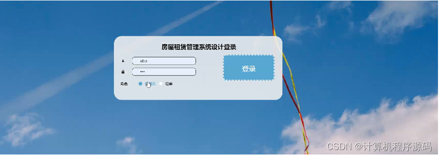 后台登录,管理员和租客进入系统前在登录页面根据要求填写用户名和密码,选择角色等信息,点击登录进行登录操作,如图5-5所示。