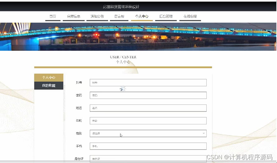 个人中心,在个人中心页面通过填写账号,密码,姓名,年龄,性别,手机,身份证,图片等内容进行更新信息操作,还可以对我的收藏进行详细操作;如图5-4所示。