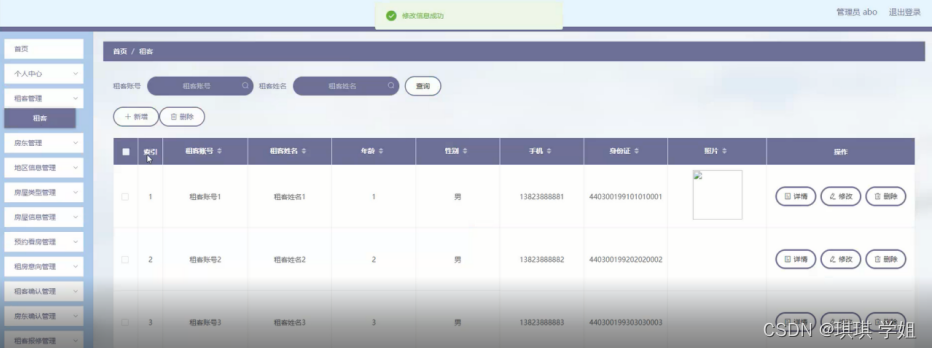 租客管理:在租客管理页面,可以查看租客账号、租客姓名、年龄、性别、手机、身份证、照片等信息进行修改、删除等操作,如图5-3所示: