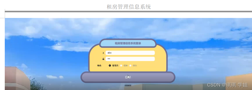 管理员要登录租房管理信息系统,需要输入用户名和密码,选择登录角色进行登录,管理员登录界面如图5-1所示: