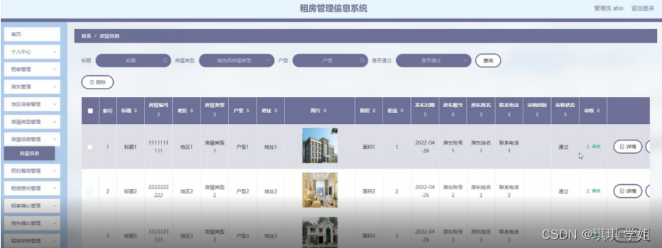 房屋信息管理:在房屋信息管理页面,可以查看标题、房屋编号、地区、房屋类型、户型、地址、图片、面积、租金、发布日期、房东账号、房东姓名、联系电话、审核回复、审核状态、审核等内容,还能对房屋信息管理进行修改、删除等操作,如图5-4所示: