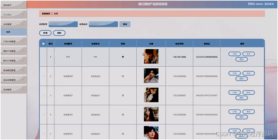 管理员点击会员管理。进入会员管理页面输入会员账号、会员姓名进行查询、新增或删除用户信息,并进行查看详情,修改和删除等操作。如图5-9所示: