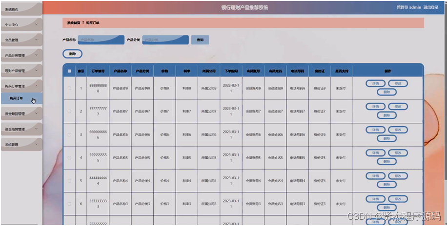 管理员点击购买订单管理,输入产品名称、产品分类可以进行查询详细信息,并且可以对购买订单进行详情、修改、删除等操作。如图5-12所示: