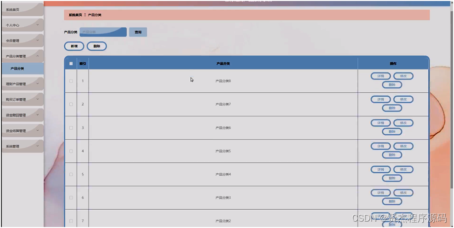 管理员点击产品分类管理。进入产品分类管理页面输入产品分类信息可以查询,新增或删除产品分类详细信息,并进行查看详情,修改和删除等操作。如图5-10所示: